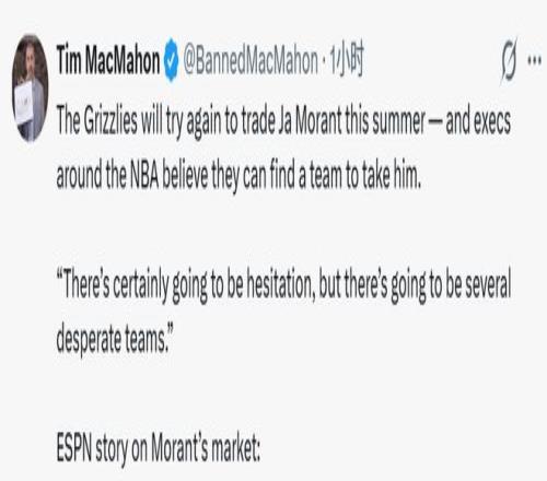 莫兰特一直在私下向旁人透露,自己不会再为灰熊打球了。“不少球队会在选秀、自由市场落空后,将目光投向贾-莫兰特,”一名西部高管分析道。